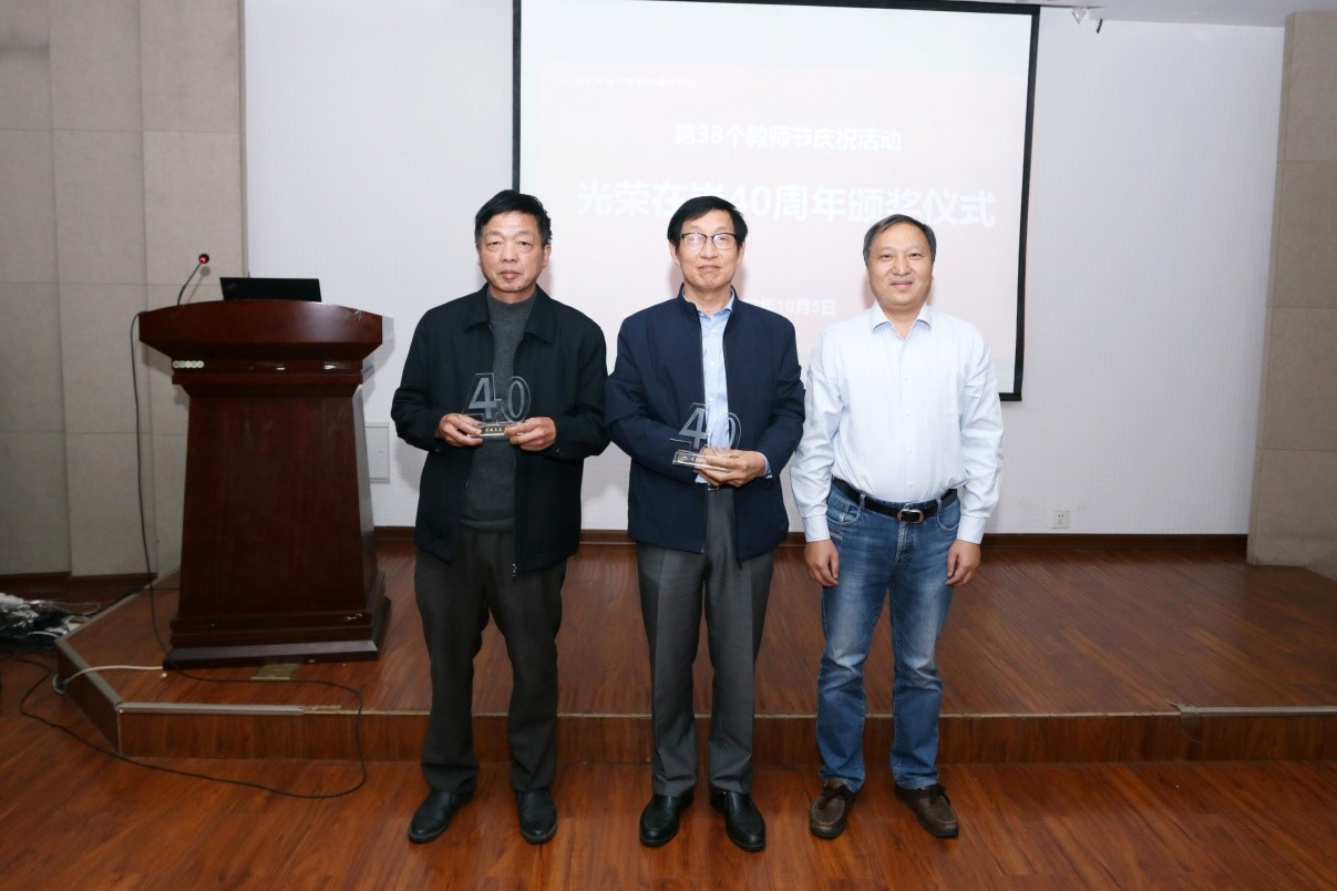 学院院长张正光为光荣在岗10周年的赵弘巍、王利民、牛冬冬、孙荆涛、张岩等五位老师,在岗30周年的王备新、樊多琦两位老师以及光荣在岗40周年的周明国、王建新两位老师颁发纪念奖杯。学院党委书记邵刚为光荣在岗20周年的张正光、王秋霞、唐玲三位老师颁发纪念奖杯。周明国、樊多琦、王秋霞、牛冬冬分别作为代表分享感悟。